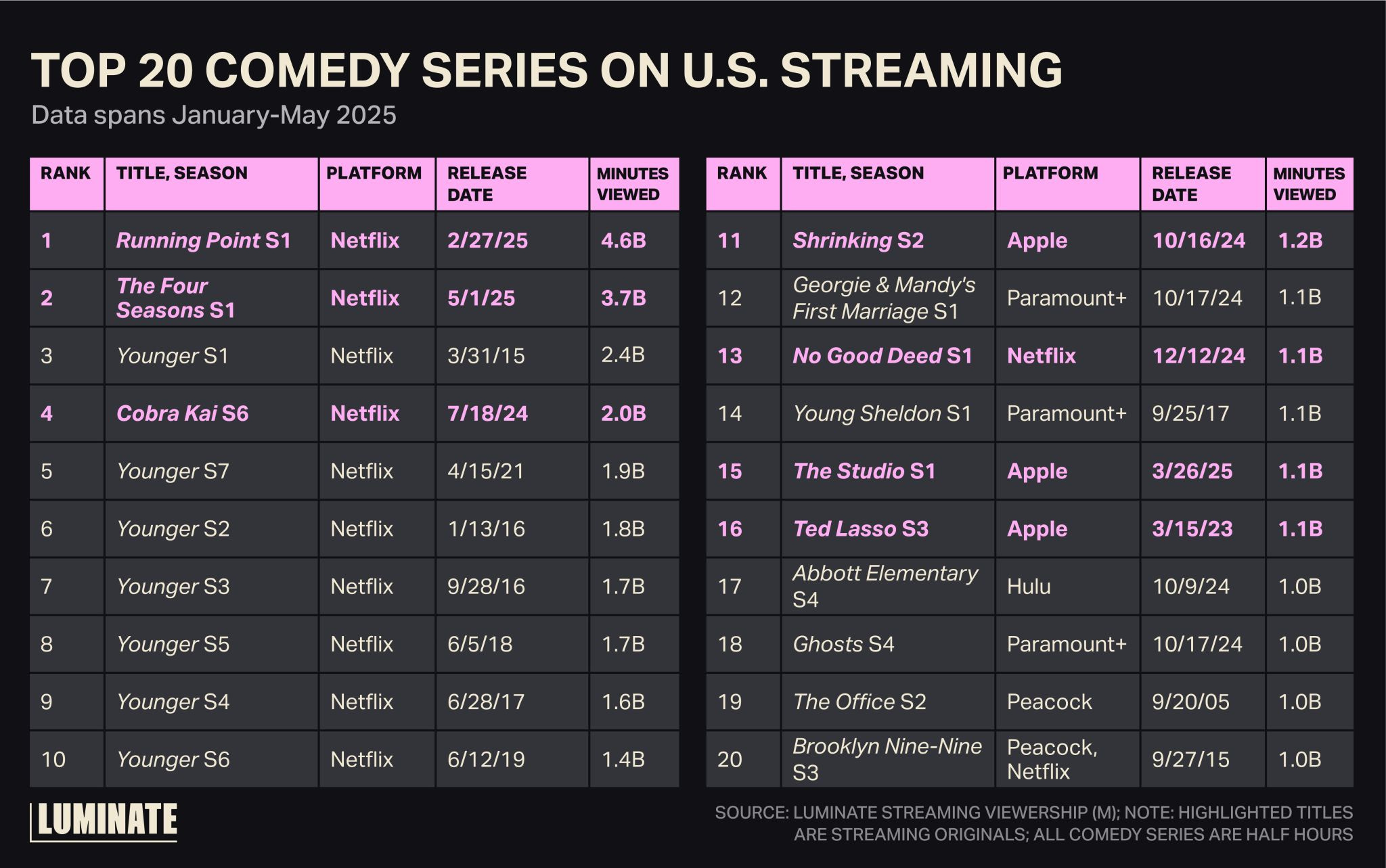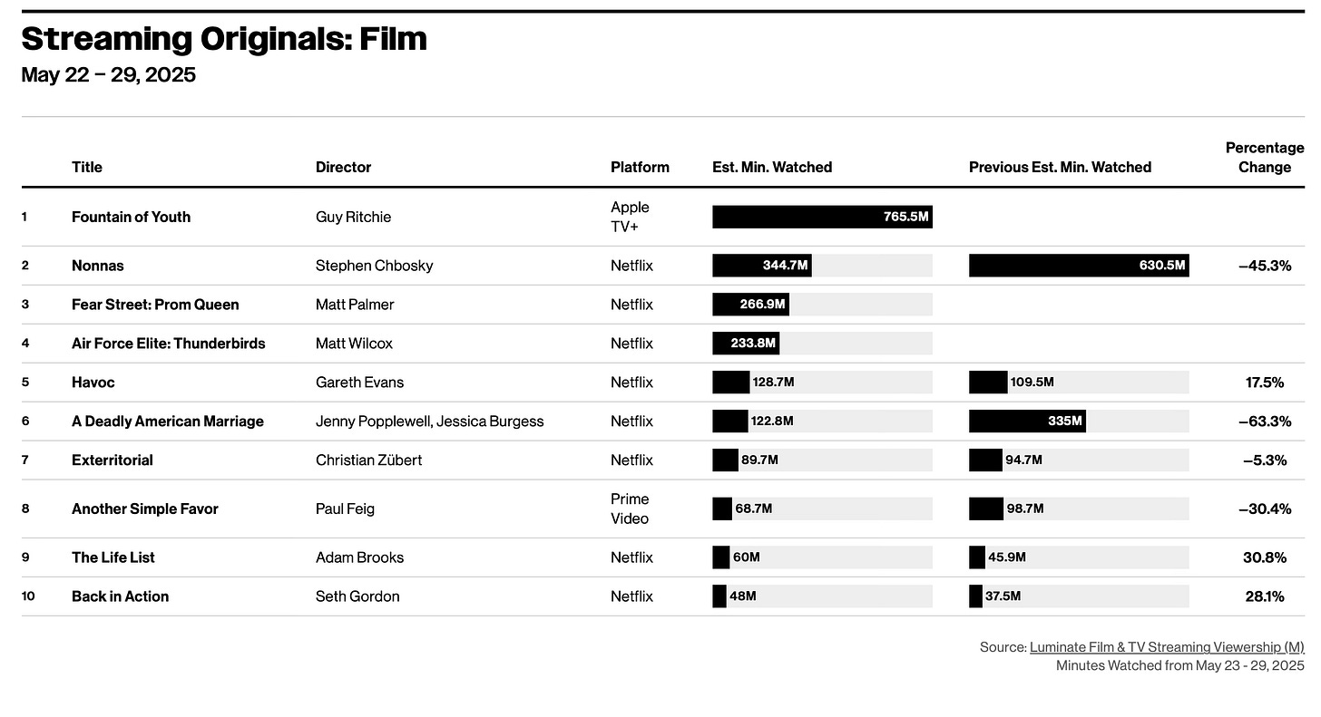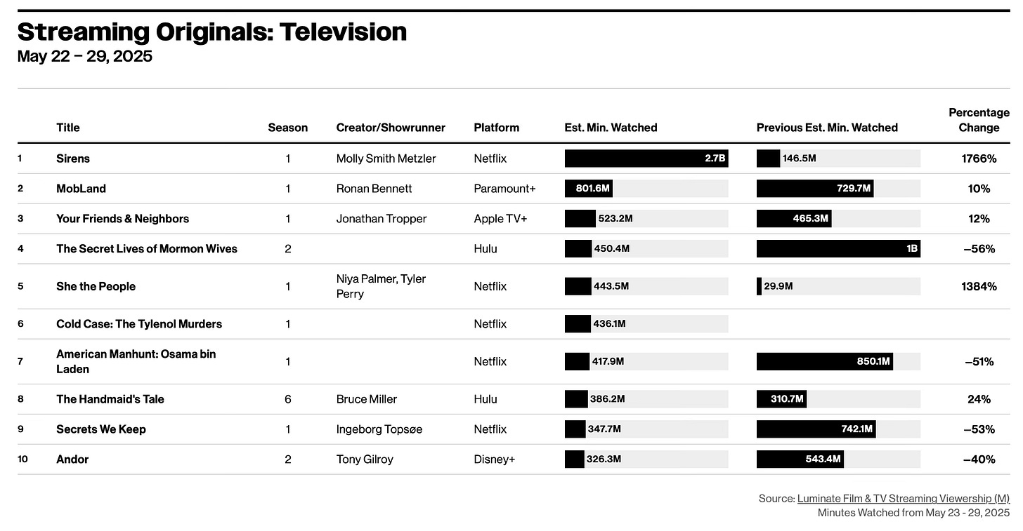 This newsletter features streaming data sourced from a range of market-research firms, including JustWatch, Luminate, Nielsen, SambaTV, and others. Unless otherwise noted, the metrics reflect the U.S. market, while also analyzing self-reported statistics from media/tech conglomerates.