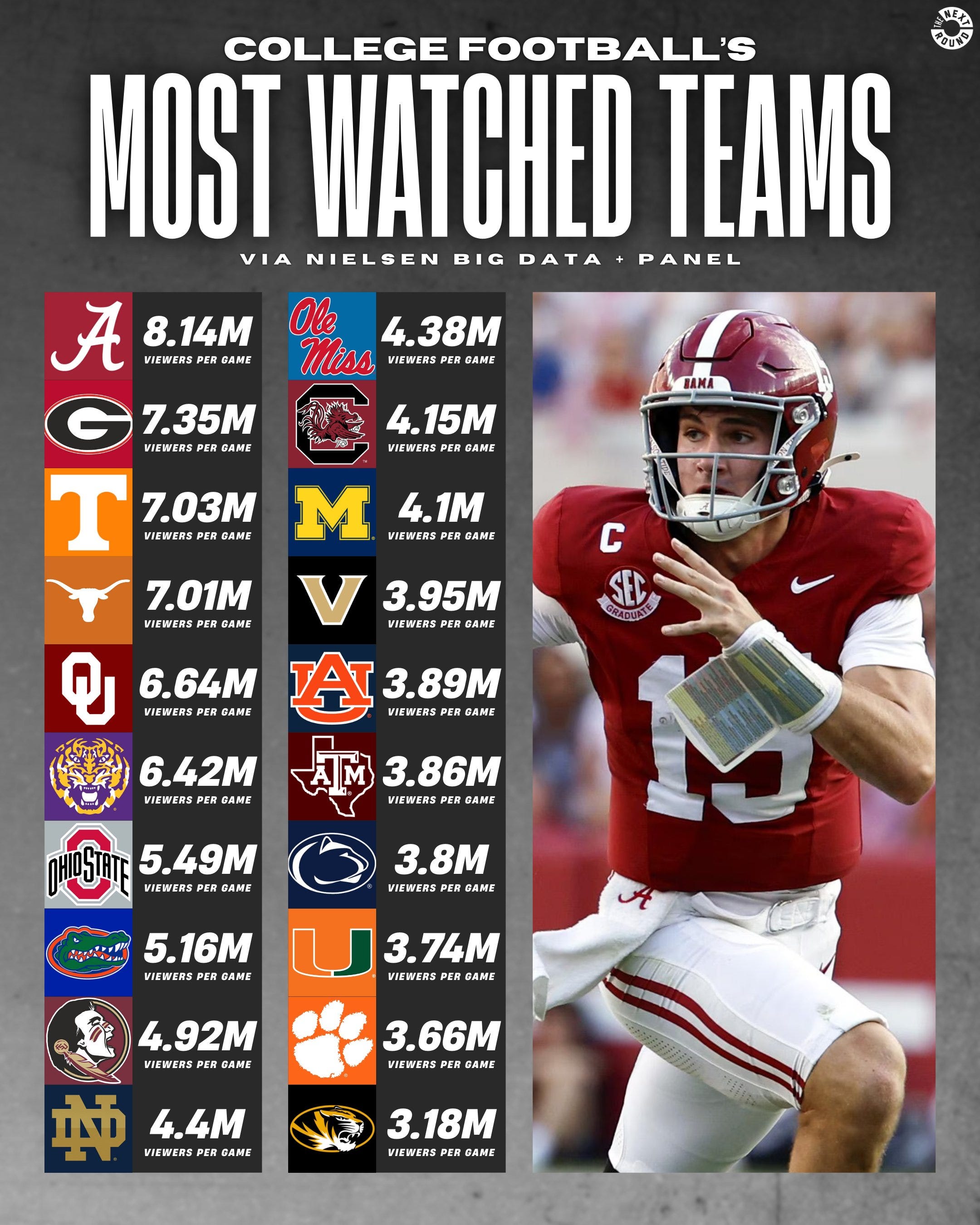 This graphic by NextRoundLive showcases the most-watched NCAA CFB teams so far this season according to Nielsenâs Big Data + Panel. Alabama leads the pack with 8.14M viewers per game and the other SEC teams dominate taking up 13 of the top 20 spots.